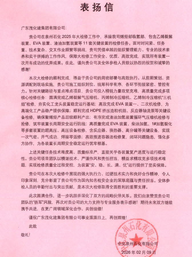 廣東茂化建集團(tuán)有限公司(簡(jiǎn)稱”茂化建”),座落在美麗的南海之濱——廣東省茂名市。她相伴著中國(guó)南方最大石化基地——茂名石化的發(fā)展壯大而發(fā)展。目前設(shè)有分(子)公司20個(gè),員工近4000人,是中國(guó)最大的集石化裝置建設(shè)、維護(hù)保運(yùn)、設(shè)備制造、房地產(chǎn)開發(fā)于一體的煉化檢安施工企業(yè)之一...... [詳細(xì)]