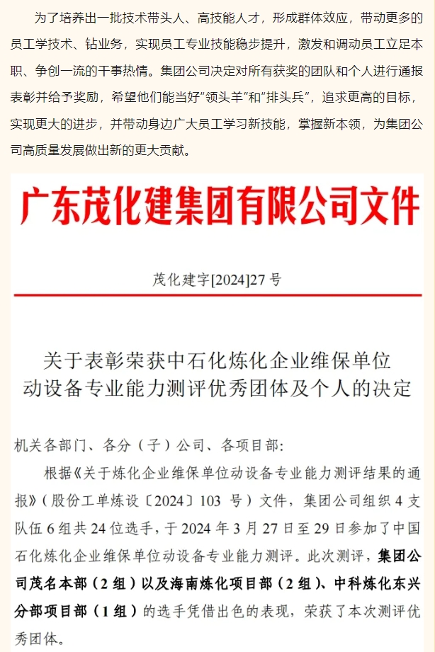 祝賀!茂化建在中石化煉化企業(yè)維保隊(duì)伍動(dòng)設(shè)備實(shí)操能力測(cè)評(píng)中成績(jī)優(yōu)異,名列前茅