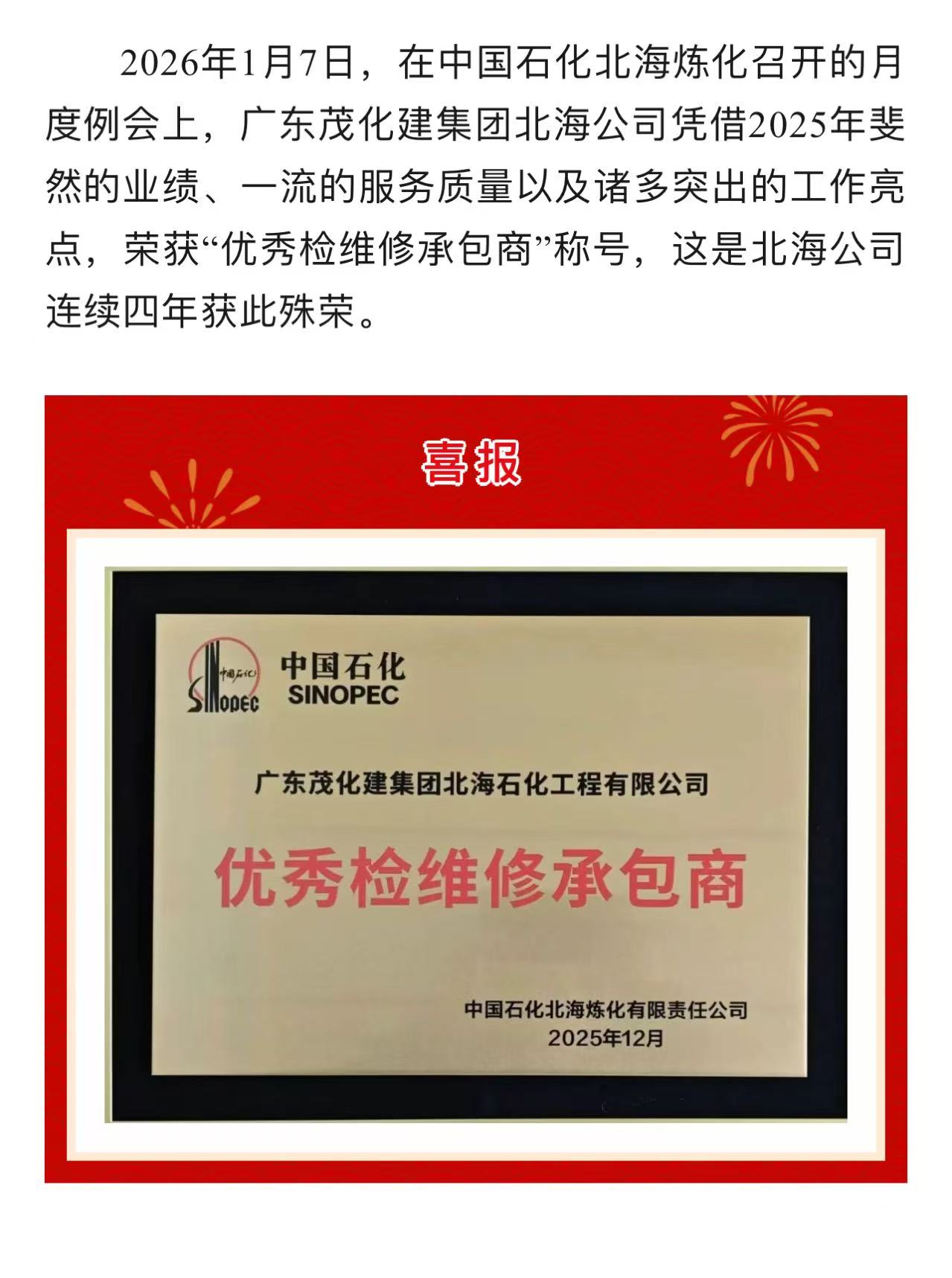 喜報 | 廣東茂化建集團北海公司榮獲2025年度“優(yōu)秀檢維修承包商”稱號